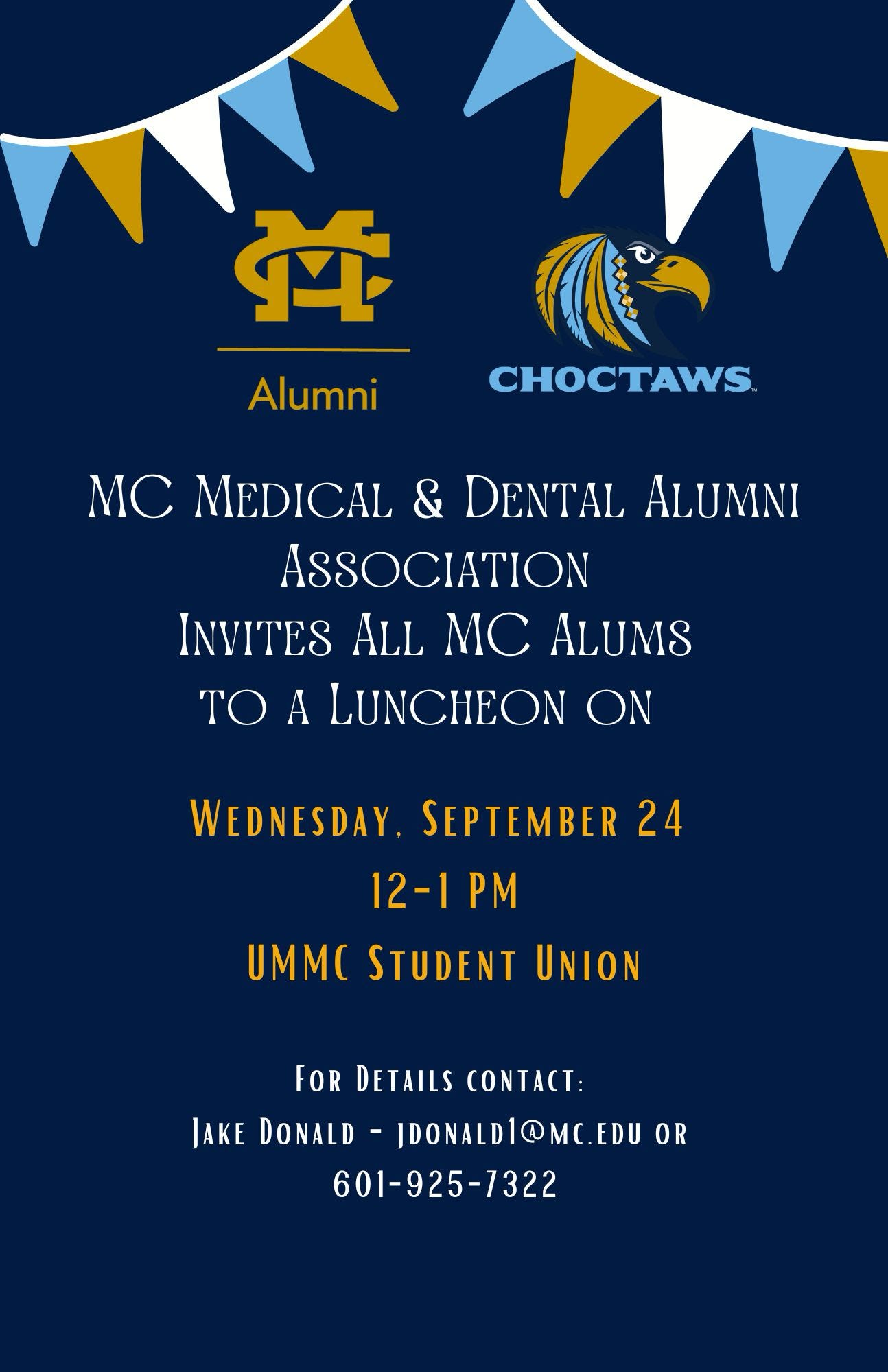 The Mississippi College Alumni Association and the Medical & Dental Alumni Association invite all MC alums in medical and dental school for lunch on Wednesday, September 24 from 12-1pm in the UMMC Student Union.