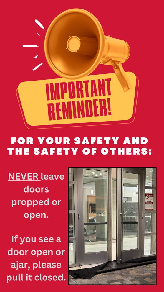 Students, please remember to be aware of your surroundings at all times. If you see doors that shouldn’t be left open, including the student lounge doors, please close them to help keep you, your classmates, and your belongings safe!