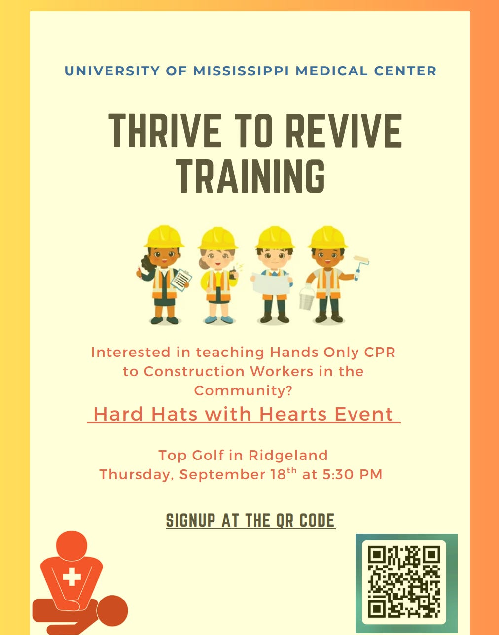 Hard Hats with Hearts. We are Seeking Medical Students interested in teaching Hands Only CPR to Construction Workers in the Community. This event will be at Top Golf in Ridgeland on Thursday, September 18th at 5:30 PM.